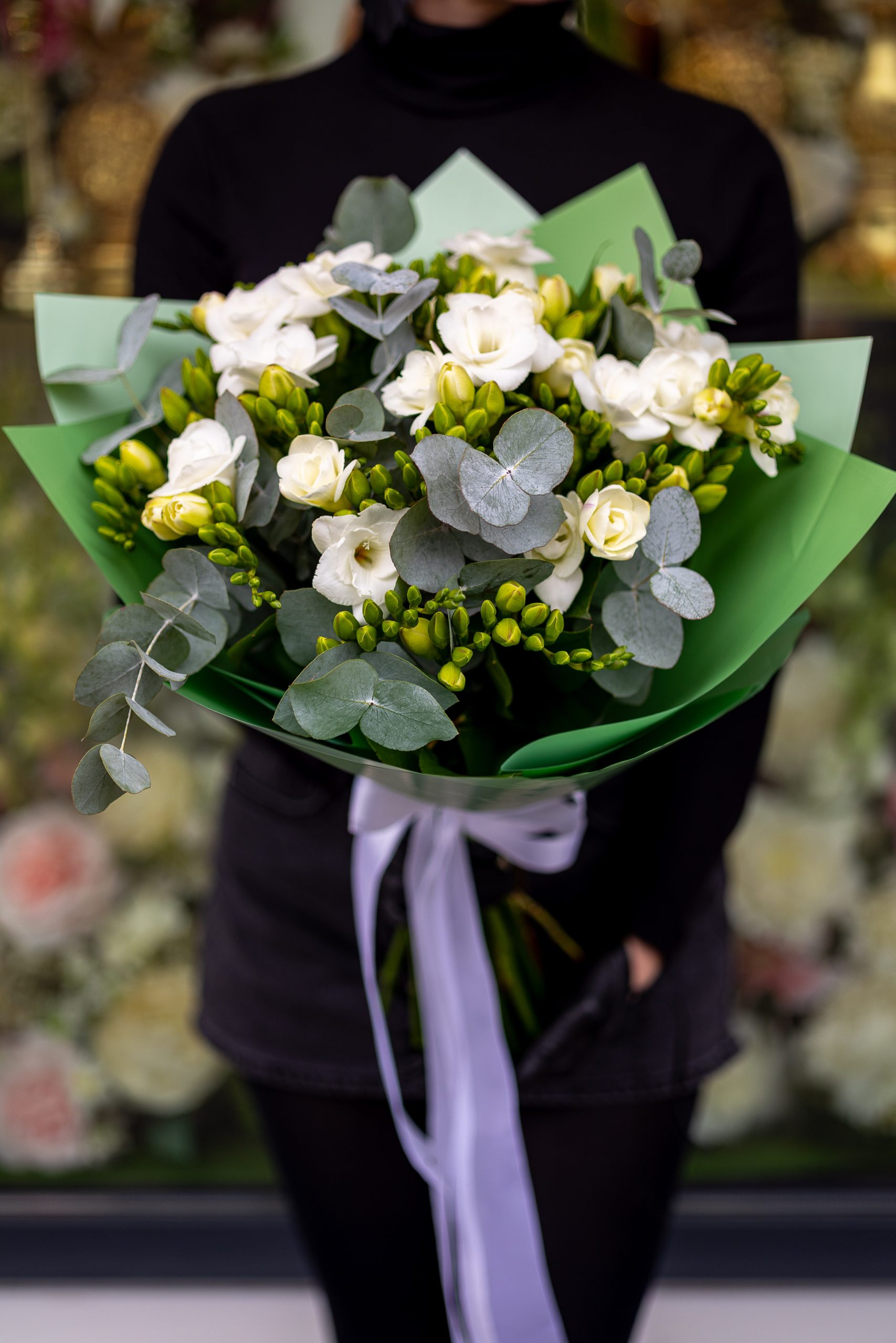 Acest buchet contine 25 x Frezii albe, 8 x Eucalipt, 10 x Salal, 1 x Saten, Folie decor.